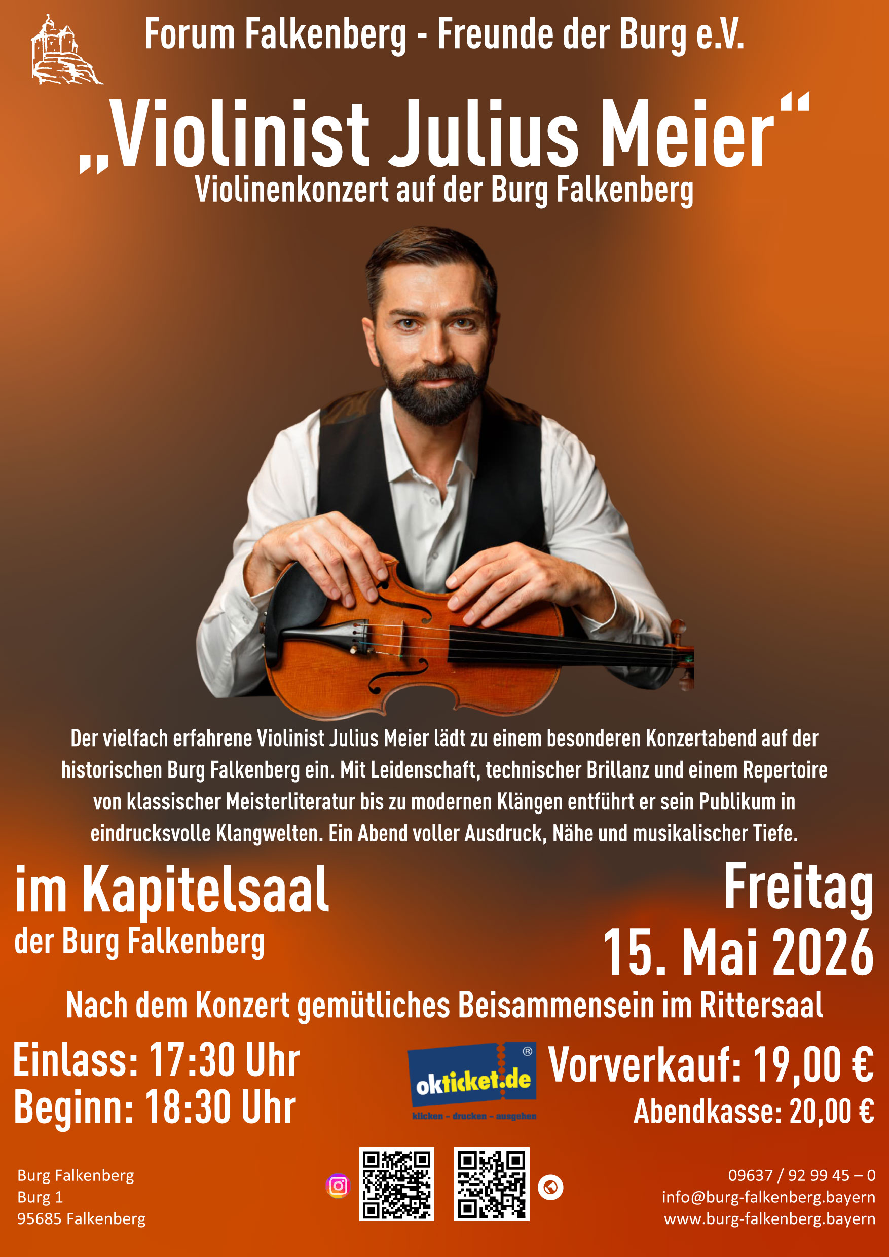 Freuen Sie sich auf einen besonderen Konzertabend mit dem vielfach erfahrenen Violinisten Julius Meier im Kapitelsaal der Burg Falkenberg. Mit großer Leidenschaft, technischer Brillanz und einem vielseitigen Repertoire von klassischer Meisterliteratur bis hin zu modernen Klangwelten entführt er sein Publikum in eindrucksvolle musikalische Sphären.