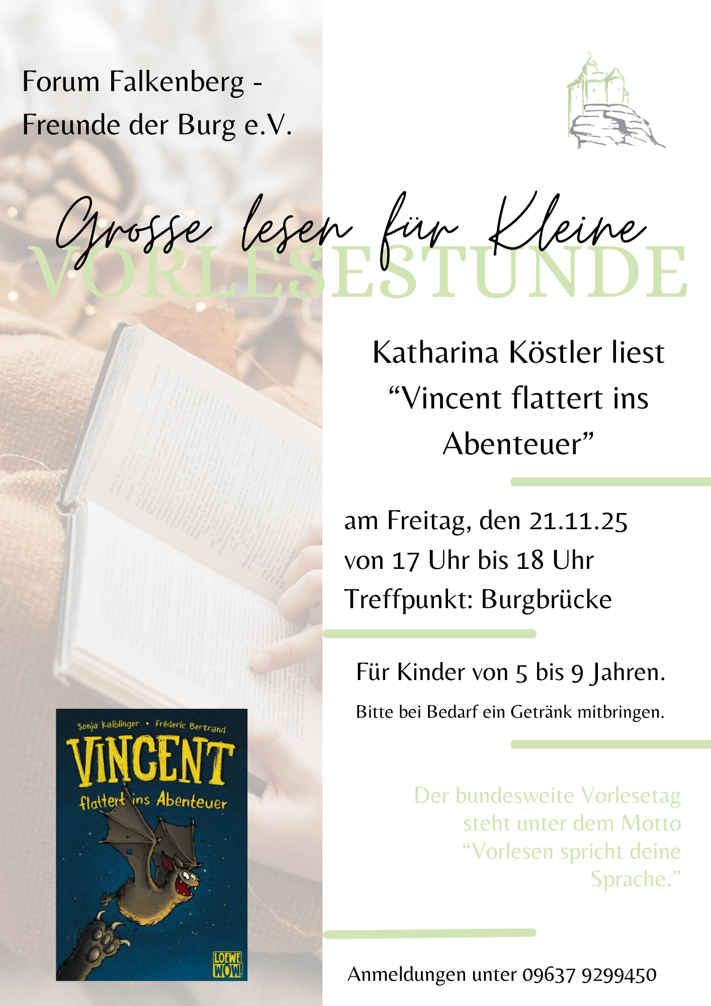 Im Zuge des bundesweiten Vorlesetag, welcher unter dem Motto "Vorlesen spricht deine Sprache" steht, liest Katharina Köstler für Kinder zwischen 5 und 9 Jahren das Buch "Vincent flattert ins Abenteuer". Bei Bedarf bitte ein Getränk mitbringen. Anmeldungen bitte unter 09637 92 99 450